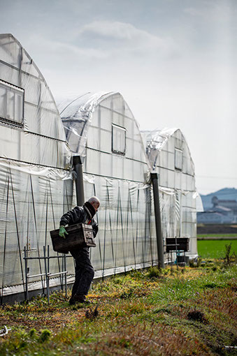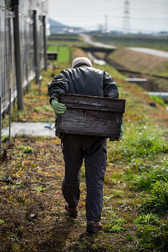 自宅庭に置いてある巣箱の内検が終わり、ポリネーション用蜜蜂の巣箱を設置に行く孝伸さんに同行させてもらった。日曜日ということもあって、イチゴ狩りの観光客でハウスの中は賑わっていた。できるだけ人の少ない経路を選び巣箱を運んで設置し、砂糖水を餌箱に注ぐ。観光客が蜜蜂に刺されるようなことがあっては大ごとだ。ポリネーション用巣箱の設置が終った後、乙隈蜂場へ案内してくれた。自宅からは車で10分ほどの所で、太古の昔には海辺だった地域らしい。そこには、鹿児島県へ移動せず福岡県で冬を越した群が置いてある。