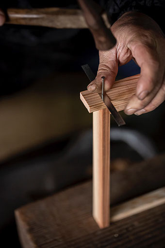 秀美さんが巣枠の駒を打つ作業をしている隣で、孝伸さんが巣枠を組み立てていく。取り寄せた木材の曲がりを、片目をつぶって確認している孝伸さんの風貌が哲学者を思わせる。