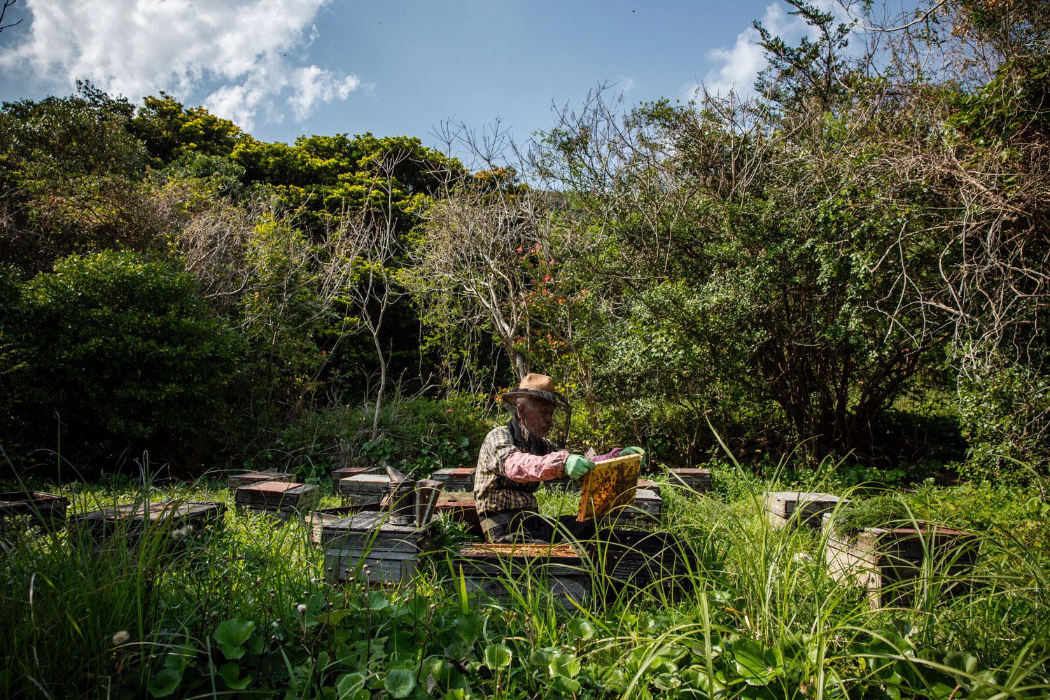 木立ちに囲まれた南さつま市坊津町坊の蜂場で、独り蜜蜂と言葉を交わしながら巣箱の入れ替え作業をする孝伸さん