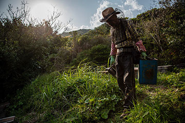 午後4時ごろになると陽が傾き、孝伸さんは巣箱の入れ替え作業に区切りを付けて宿に引き揚げる