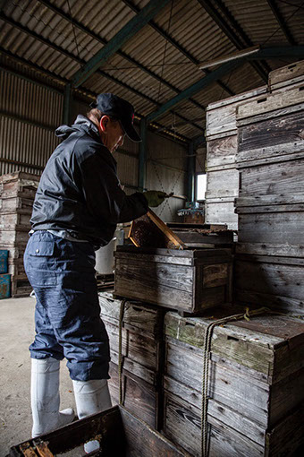 「祖父も親父も超えなければならない存在でしたから。怖かったですよ。家族は仲が良かったですよ。仕事が一緒だったからじゃないですか。それでも私は反発ばかりしていて、本当に蜂をやり始めたのは、親父が亡くなってからですからね。米、植木、造園などあれこれと凌いできましたよ。いま、養蜂一つになって楽になりましたね。昔は女房と2人で、最高で400群ぐらい扱いよりましたからね。3代続いた養蜂業を、どう引き継いでいけるか。それが、私の一番の命題ですよ。うちの蜂蜜を買ってくださっているお客さんがおられるし、ポリネーションの需要もあって、養蜂家にとって今は一番良い時代だと思いますよ。生まれた時から蜂屋ですから、技術を伝えるのにキャリアは負けない。何より蜂が好きでないとね」