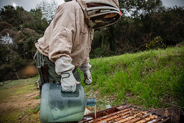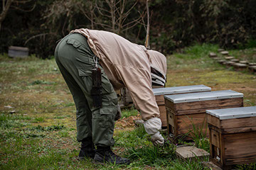 外国製の防護服を着て岱明町の蜂場で内検をする一俊さん