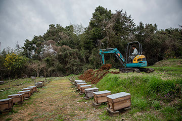 内検を終えると、一俊さんが独りでユンボを運転し蜂場の整備を行う。「上の段もあるから1週間ぐらいでできるかな」