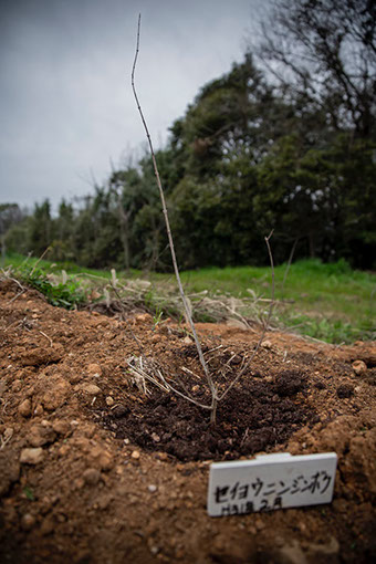 以前みかんを植えてあった畑を歩いていると、何の木か植えたばかりの苗木が目に止まった。小さな立て札に「セイヨウニンジンボク 平成31年2月21日」とある。一俊さんに確認すると、セイヨウニンジンボクは8月に花を咲かせる蜜源として植えたのだそうだ。今は空き地になっている広い元のみかん畑には、来年の春の蜜源として菜の花とレンゲの種を蒔く計画だと言う。