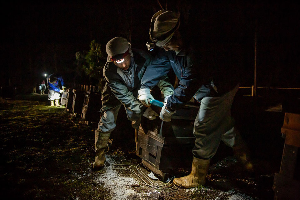 外山蜂場は、1998年に竣工した多目的の大松川ダムによってできた「みたけ湖」に水没した集落に近い山中にあった。道路脇に残っている雪の塊が車のヘッドライトに一瞬浮かぶ。外山蜂場にはヘッドランプを点けた従業員6人が集まっていた。午後10時ごろに章さんのトラックが到着する予定だ。それまでに電柵を張り終えなければならない。