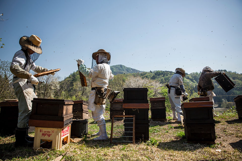 この日は、昨日体調が悪く休んでいた章さんの長男の安士信章さん(32)も姿を見せていたし、事務職として働く照井紀子さん(58)も蜂場の仕事に駆り出されていた。総勢9人での作業だ。