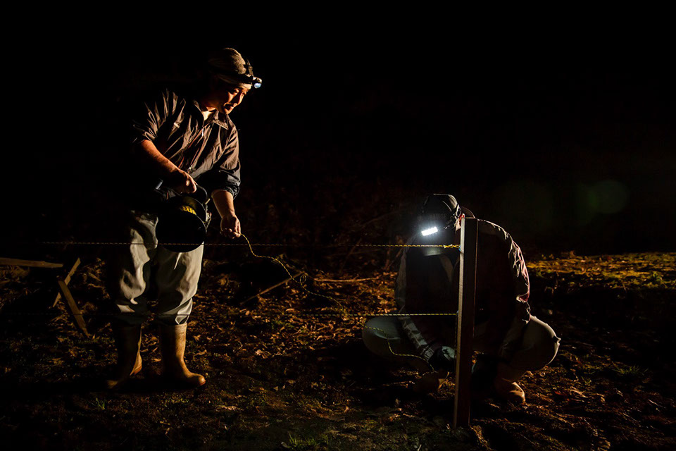 闇の中でヘッドランプだけを頼りに、黙々と杭を打ち電線を張り巡らしていく。この時期は毎夜繰り返されている作業なので、自ずと役割は決まっているのだろう、打合せもないまま始まった作業は1時間足らずで終わった。