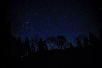 熊避けの電柵張りが終わり休憩時間に夜空を見上げると、木立の間から満天の星空が輝く