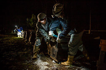 山形県から引き取ってきたポリネーション用の蜜蜂を外山蜂場に整然と設置し、カバーを掛ける作業が夜中まで続く