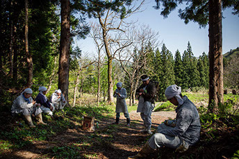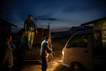 外山蜂場は、1998年に竣工した多目的の大松川ダムによってできた「みたけ湖」に水没した集落に近い山中にあった。道路脇に残っている雪の塊が車のヘッドライトに一瞬浮かぶ。外山蜂場にはヘッドランプを点けた従業員6人が集まっていた。午後10時ごろに章さんのトラックが到着する予定だ。それまでに電柵を張り終えなければならない。