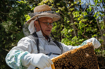 堂ノ上蜂場で従業員と一緒に内検をしていた安士養蜂園代表の安士章(やし あきら)さん(64)が、手を休めることなく蜜蜂の状態を説明してくれる。