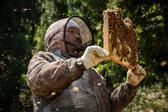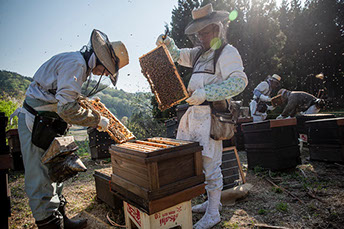 空が広い南郷蜂場の蜜蜂群は、安士章さんが「元気な羽音でしょう」と言うほどに蜂数が多く、内検をする従業員にもゆったりとした時間が流れる