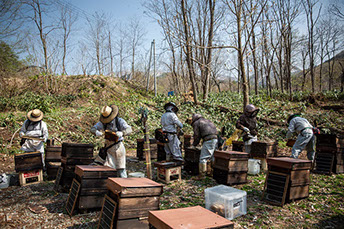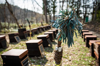 そんな静かな時間も束の間。章さんの運転する4トントラックが巣箱を満載にして到着すると、従業員は一斉に背中に巣箱を担いで蜂場に運び込み、巣門を開け、カバーを被せていく。蜂場は整然と並んだ巣箱でみるみる一杯になっていった。