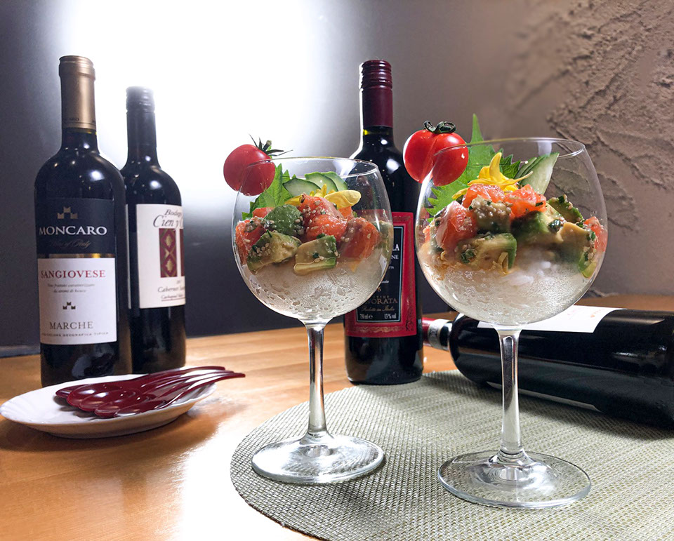 緑色のアボカドと明るいオレンジ色のサーモン、それに錦糸卵の黄色。なんとも華やかなグラスを手にすると、口に運ぶ前からゴマ油の香りが食欲を促す。「アボカドとゴマ油は合いますよね。魚は何でも、マグロでも良いですね」と、良祐シェフ。