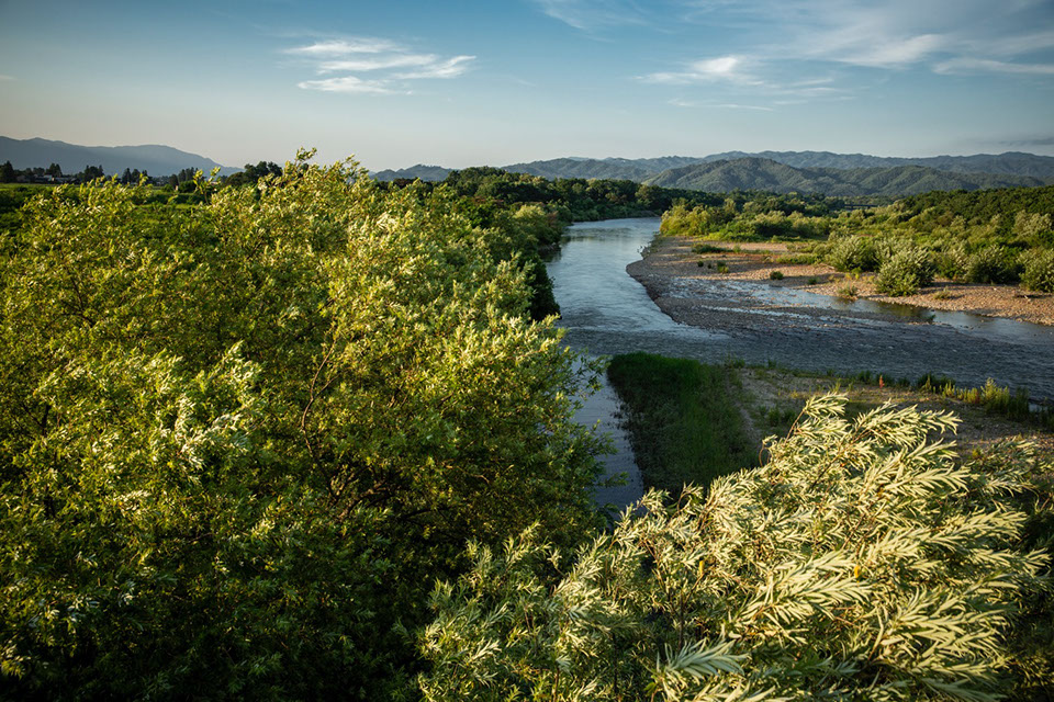 アカシアの花の時期は、この白川に巣箱を置いて採蜜する。「川沿いがアカシアの蜂場なんですけど、そこに熊がでるんですよ」と光栄さん