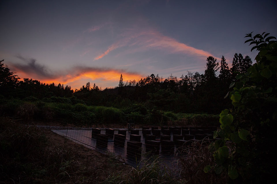 飯豊連峰の裾野にある貯水地上蜂場の日暮れ。ここの蜂場では巣箱の下全面にシートを敷き、蜜蜂の状態を観察し易く工夫している