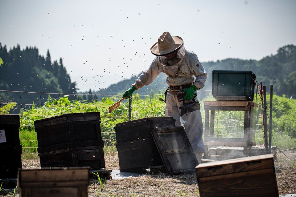 「ネオニコチノイド系農薬が出てから女王蜂の寿命が短くなってしまって、それから養蜂がずいぶん変わりました。こういう仕事をしていると、自然の変化を直に感じますね。蜂が減っていくのが分かるんですよ。この養蜂という仕事は波がすごいですもん。ネオニコチノイド系の農薬が出始めた頃には、200群ぐらい居なくなったのかな。最終的には30箱ぐらいしか残らなくて、その当時は、ネオニコチノイドがそんだけ悪さするとは知らなかったですから。内検すると、1週間ごとに巣板1枚分ずつ減っていって、どんどん減っていって、死骸はどこにあるんだと思ってました」
