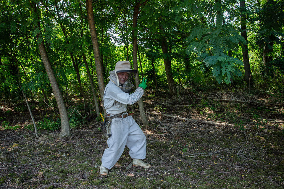 真夏の太陽を避けて寺分蜂場の傍らにあるアカシアの木立に入り小休止している祐太さんにレンズを向けると戯けたポーズをとった