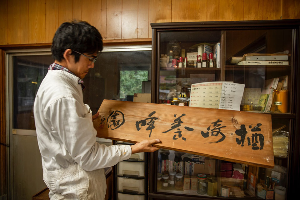 養蜂家2代目となる父親の正さんが書道家に揮毫してもらった楢﨑養蜂園の看板