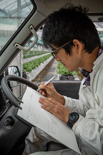 イチゴハウスに巣箱を配達する度に記録をノートに残す