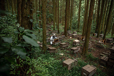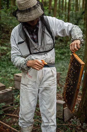 謙竜さんは続いて杉林の中にある王丸(おうまる)蜂場へ向かった。ここでも交配用に貸し出す蜜蜂群の準備だ。杉林の中の蜂場は曇り空のせいもあって薄暗くひっそりしている。しばらく内検を続けていた謙竜さん、一つの巣箱から次々と巣板を取りだし焼酎を噴霧して群固有の匂いを消した後、別の巣箱に一枚ずつ合同している。