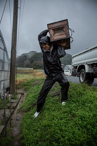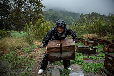 急斜面に用心しながら交配用蜜蜂の巣箱を配達する謙竜さん