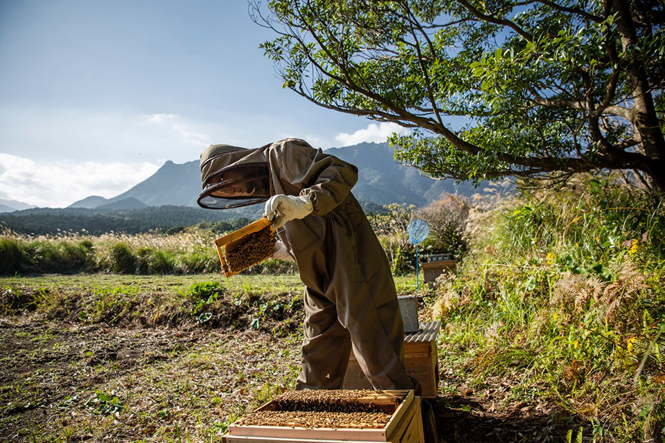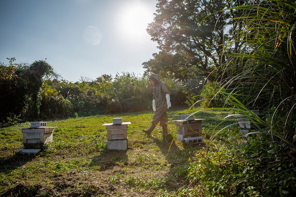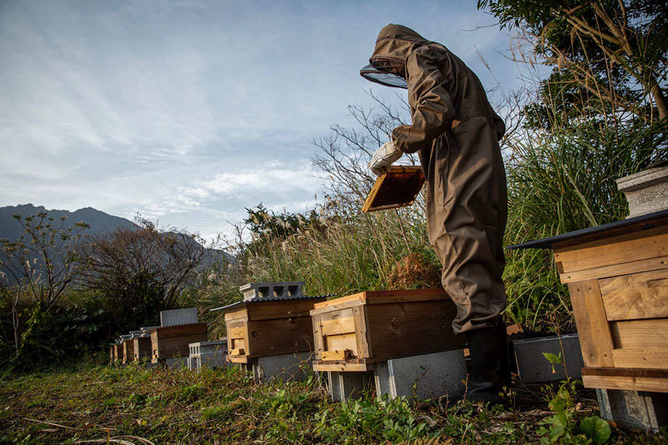 「それまでは蜂を増やしていくことで精一杯でしたからね。蜜を搾った時の感動は忘れられないですね。巣箱を置いている蜂場によっても蜜の味は違いますから面白いですよね。タンカンの蜂蜜は、さっぱりと優しい甘さです。タンカン畑に巣箱を置かせてもらったんです。レンゲの蜂蜜は、自分たちで種を蒔いたレンゲで、去年は11キロしか採れなかったです。百花蜜は、夏を越して秋に搾ったんですけど、センダングサも入っていると思いますけど、香りの濃い馴染みのある甘さですね。糖度は82度、口の中でねっとりしますけど、舌の上で溶けていきますよ。自分たちからすると、蜜蜂が一生を通じて集めた蜜の価値を考えると、売られている蜂蜜の価格は安すぎると思います。私も嫁も、お酒の業界に居たので、ウィスキーのブレンダーのような役割を果たすことはできないのかなと思っているんですけどね」
