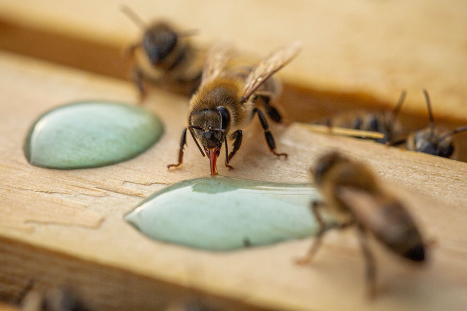 久保さんが与えた砂糖水の雫を口吻を突き出して吸う蜜蜂