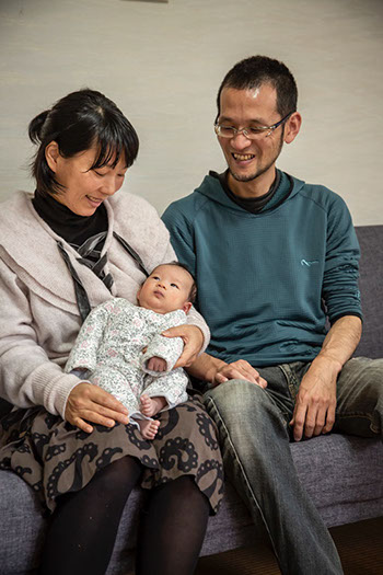 自宅居間で久保太さんと妻の律さん、それに生後2か月の天音ちゃん。「初めての子どもが女の子だったので、もうメロメロですね」