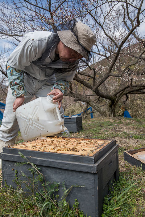 そう言いながら、巣箱の中にある給餌箱にグラニュー糖を溶かして作った餌を注ぐ。基本的には、1週間に1回行う内検という作業で、女王蜂の産卵を確認し、与えておいた餌の減り具合やダニや病気の有無を確認していく。内検している悌さんは、細かい網目の面布(めんぷ)を顔に被っているが、巣板を点検する作業は素手で行っている。