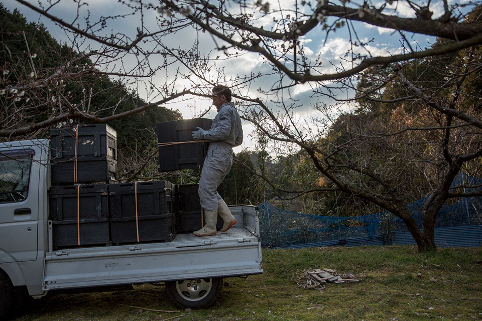 梅農家へ貸し出す巣箱を軽トラックに積み込む。夕方にならないと蜜蜂が巣箱に帰らないため、作業はいつも日暮れ近くなってしまう