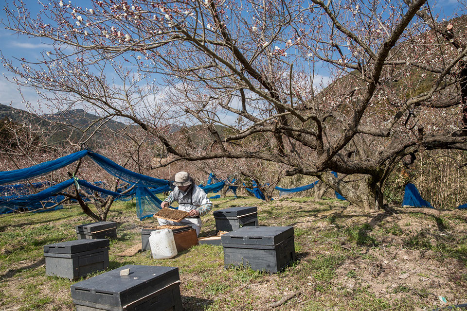 悌さんが山間部の梅畑で内検をする。女王蜂の産卵の状態や餌の減り具合を確認して、蜜蜂の健康状態を把握する