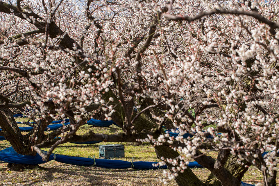 樹齢28年の梅が、ようやく7分咲きとなった。梅畑に置かれた巣箱一個に約12000匹の蜜蜂が入っている
