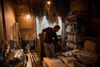 親密さを感じさせる同業者との軽妙なやりとりの中に、開店したばかりのカフェ「HONEY TETSU」を、悌さんがさりげなくアピールする。小雪が舞うこの日、悌さんは一人倉庫の中で、巣板に巣礎(すそ)を張るために枠の針金を引く作業や、蜂に与える砂糖水を作る作業を黙々と続けていた。