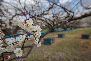 どちらを向いても梅畑が広がるみなべ町は、梅の花が早くから咲くため、全国のどこよりも早く採蜜できる蜜蜂の群れは成長が著しい。みなべ町では、梅と蜜蜂は共存共栄の関係なのだ。