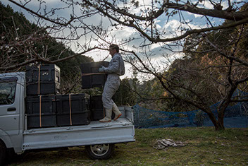 こんな所にまでと思わせる山間部の急斜面に植え付けられた梅の木に、ちらほらと白い花が咲き始めている。そんな急斜面の梅畑を縫うように続く農道を、マイナンバー3838(みつばち・みつばち)の軽トラックが駆け上っていく。中村養蜂園2代目、中村悌(やすし)さん(37)だ。大粒で肉厚な梅干しで知られる南高梅(なんこううめ)発祥の地、和歌山県日高郡みなべ町では梅の開花時期を迎えていた。