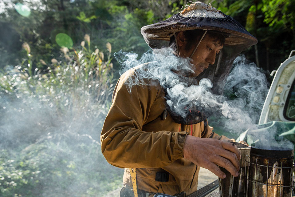 「宮城さんの畑」と呼ぶ蜂場で採蜜できる蜜巣板を確認するため、三浦大樹さんが燻煙器に火を点ける