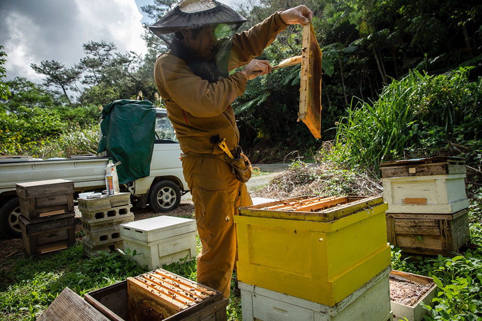 「独立してシーカヤックガイドをやろうとしたんですが、独立すれば同じ会社で自分の仲間だったり先輩だった人たちと張り合うことになるんですね。お世話になった先輩たちと同じ土俵で競争はできないと……。それでガイドと養蜂の兼業を考えた訳です。ガイドは夏と年末年始が忙しいけど、蜜蜂の忙しい時期は逆なんですよ。それで、妻がアルバイトをしていた養蜂の師匠のところに勉強に行ったのですが、その時に蜜蜂が兼業でやっていけるものではないと分かりました。それで1年間はしっかりやってみようと思って、先ず蜜蜂の群を増やすことを目指しましたね。師匠が『分封している群を見つけたら持って行っていいよ』って、言ってくれましてね。師匠の蜂場では分封が当たり前だったんで、分封群を追い掛けてましたね。それであっという間に10群ぐらいに増えて……。丸2年過ぎた時には40群ぐらいになっていて、沖縄県養蜂組合に入りました。それから間もなく80群まで増やしました。でも、最初の3年間はほとんど収入が無かったんで、妻が地元の会社に就職してくれて、何とかやってこれました」