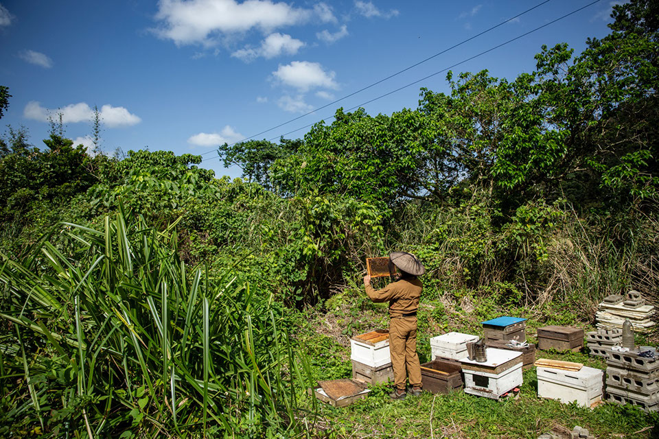 「妻が大阪でネイチャーガイドをやっている時に、養蜂家と出会って蜜ロウを知ったんです。皮膚が敏感な妻は、保湿用に蜜ロウを使って自分の肌をケアしていたんですね。彼女が養蜂家と出会ってなかったら、今の私たちの暮らしはないです。私の半年後に彼女も沖縄へ来てくれて、彼女は大阪で養蜂の仕事を手伝っていたこともあって、沖縄に来た当初は養蜂のアルバイトをやっていたんです。その時、私は採蜜のお手伝いで行く程度だったんですけど、そのうち自分の蜂蜜ぐらい自分で採りたいなと思って、その養蜂家から蜜蜂群1箱を購入して、今、加工場がある場所に置かせてもらったのが始まりでした。地主の大城さんからは『うちの裏のススキ畑を自由に使っていいよ』って言ってもらったんですけど、そこはほとんど森だったんですよ。それで森の草刈りから始まったんです。その時は(蜂蜜が)採れるかな採れないかなって不安な感じでしたね」