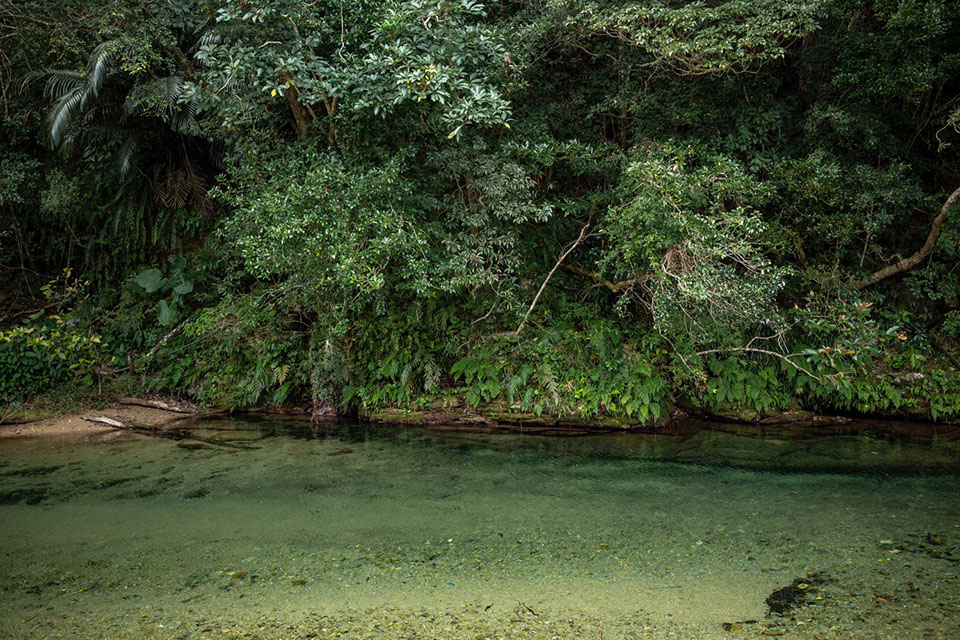 「真栄田さんの畑」と呼ぶ蜂場の近くを流れる山原の森から流れ出た清流。この岸辺にフカノキの大木がある