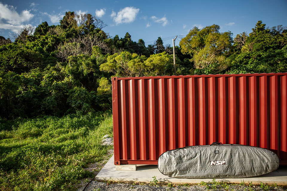 コンクリートで土間打ちをした加工場横に設置したコンテナ倉庫。裏には、アウトドアライフを志向する三浦さんらしく