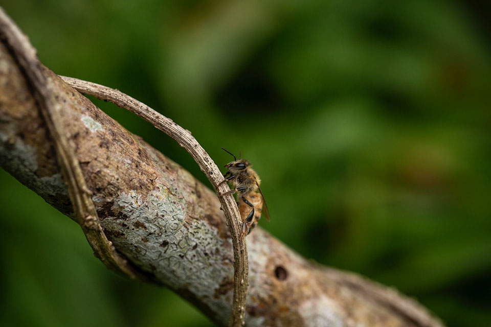 差し掛けた棒を必死で登り、自分の巣箱に辿り着こうとする飛ぶことができない若い内勤蜂