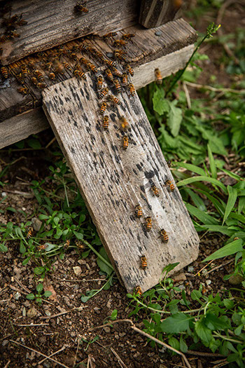 内検が終わると、巣箱の外に払い落とされた蜜蜂が一段高くなっている巣箱に帰るため一枚の板を差し掛けている。内勤蜂は若くて飛べないので、この板を歩いて帰るのだ。巣門の前で門番の蜂が尻を高く上げて出すフェロモンで、「お前の家はここだぞ」と誘っている。三浦さんの巣箱はコンクリートブロックの上に載せてあって一般的な巣箱より高くなっている。その上、巣箱の脚がプラスチックのケースの中に入っていて雨水が溜まる仕掛けだ。