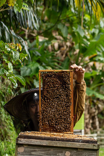 「〈食でつながる。食で動き出す。〉をコンセプトに『やんばるは美味しい』を発信しています。地域の食材をメニュー化して地域を盛り上げるプロジェクトなんですけど、この繫がりがなかったら、今の僕はいません。沖縄に移住してきた当時、ネイチャーガイドとして海遊びをしていた友だちが、生産者や飲食店だったので、仲間に入れて貰えたのは大きな一歩でした。沖縄は交配用蜜蜂と種蜂を作る養蜂家がほとんどなので、僕も最初は種蜂を増やしていたんですが、やんばる畑人プロジェクトに入れて貰ったお蔭で蜂蜜の方へ移行することが出来ましたからね。といっても、蜂蜜は未だ全体の半分ですけどね」