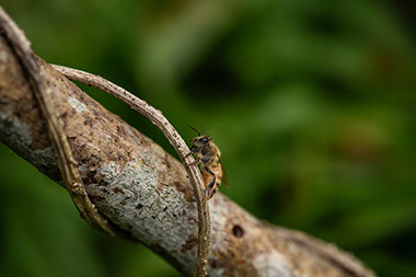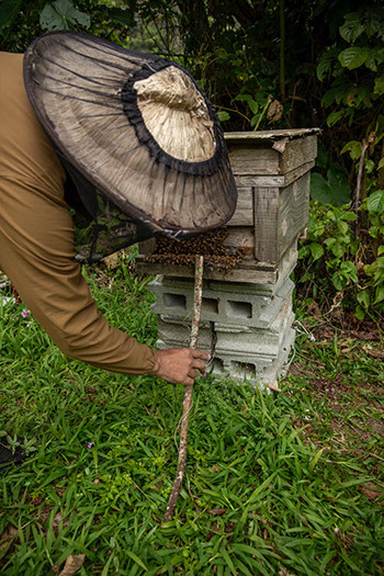 若い内勤蜂が帰るため棒を差し掛けてやる