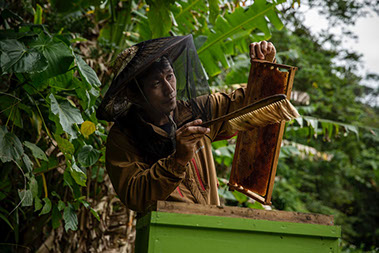 「前田さんの畑」蜂場で内検をする三浦さん。卵は産まれているか、幼虫は無事に育っているか、餌はあるかなどを点検する