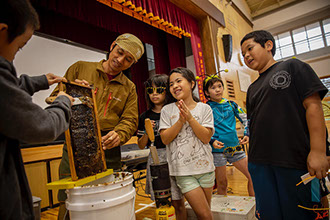 名護市内にある名桜大学の学生が蜜蓋切りなど採密を手伝う