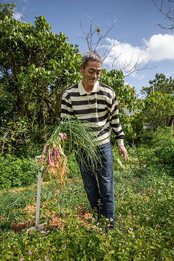 「土地を貸しているのは三浦さんのところだけじゃないよ。貸している土地は2000坪あるけどさ、一坪30円、年にだよ。車の税金払うのに精一杯。持ってきた島ラッキョは紫ラッキョって言うさ。茎を食べるために土盛りをして、茎を長くするさ」