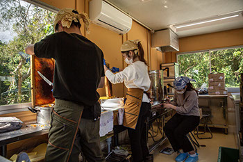 加工場での採蜜には名護市にある名桜大学国際学群国際学類の学生が3人手伝いに来ていた。国際ボランティアをするのに「費用を得るため蜜蜂を飼いたい」と三浦さんに相談に来たのがきっかけなのだ。まだ、自分たちで蜜蜂を飼うまではいかないが、蜜蓋を切ったり遠心分離器に蜜巣板をセットしたりすることで、次第に養蜂に馴染んでいくことだろう。