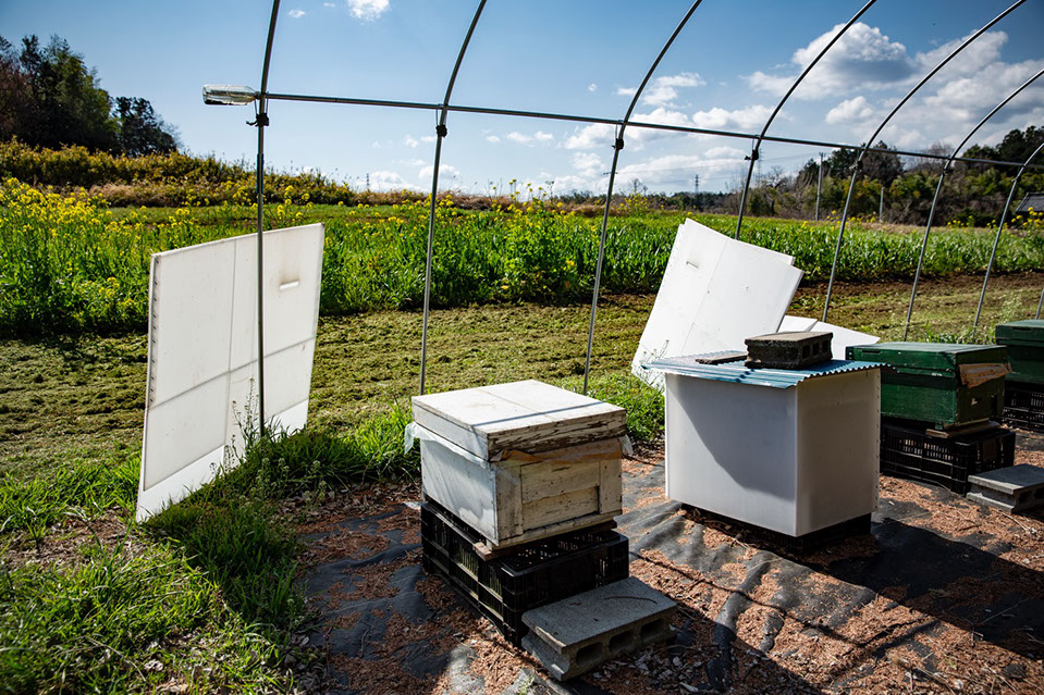 高田さんから買い取った蜜蜂の巣箱は芝蜂場に運び込み、巣箱の被せるための防風カバーが準備された